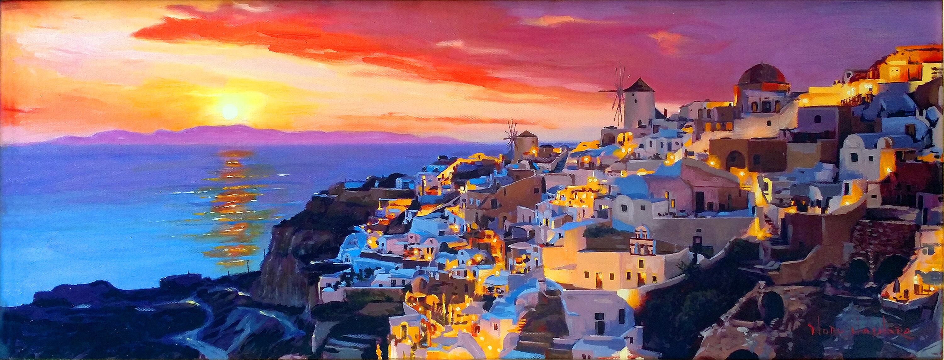 ノブ ハイハラ『夕日のサントリーニ』 リトグラフ・送料無料・新品額装・UVカットアクリル仕様